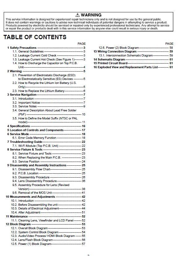 Inside this service manual you will be presented with the following in-depth technical information; Specifications, Service Modes, Locations of Controls and Components, Service Fixtures and Tools, Disassembly & Assembly Instructions, Measurements and Adjustments, Maintenance, Wiring Connection Diagram, Exploded Views & Full Parts List Catalog